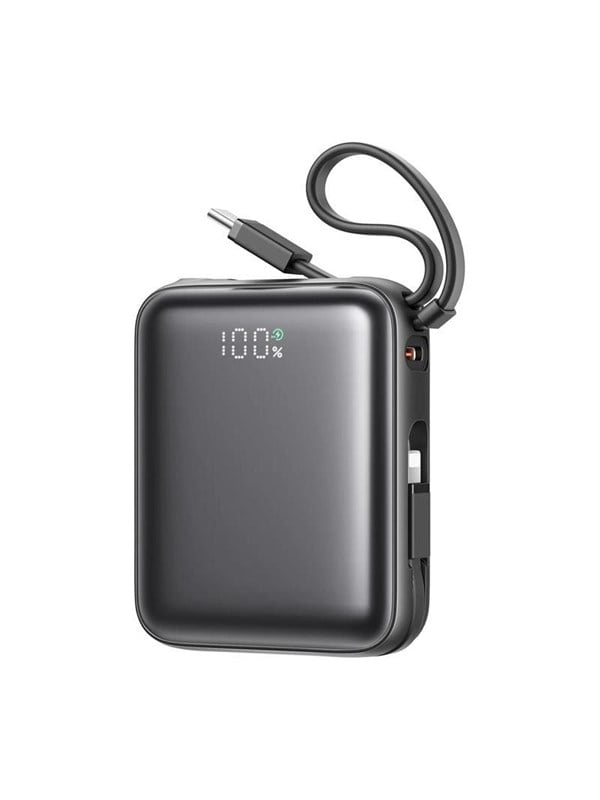 Joyroom JR-PBF27 Mini PowerBank (sort) har 10000 mAh kapacitet og 22,5 W hurtigopladning. Indbyggede USB-C og Lightning kabler gør, at du ikke behøver ekstra ledninger. Bi-retning opladning giver hurtig genopfyldning og mulighed for samtidig opladning af