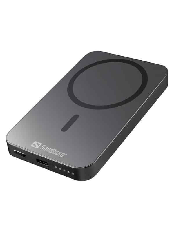 Sandberg Mag Wireless Powerbank 5000 ALU er en super smart powerbank med adskillige opladningsfunktioner. Qi-kompatible smartphones kan lades helt trådløst ved, at du lægger telefonen på ladepladen på toppen af powerbanken. Ladepladen er magnetisk og kan