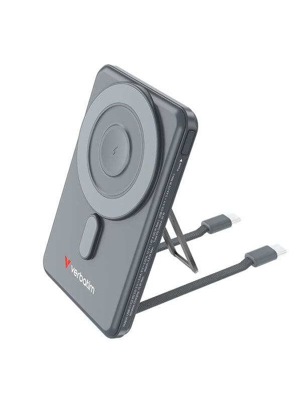 Powerbank med 5,000mAh kapacitet, MagSafe-kompatibel magnetisk trådløs opladning op til 15W, to integrerede USB-C-kabler og USB-C PD hurtigopladning til flere enheder.Kompakt backup-strøm: Charge ‘n’ Go Two Cable Power Bank Magnetic Wireless Charging 5,00